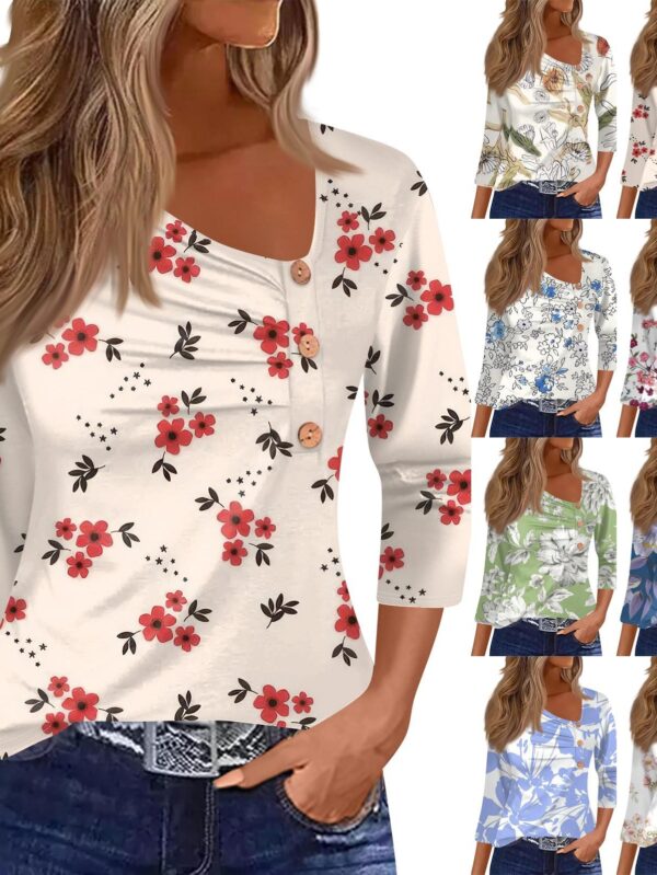Women's Three-quarter Sleeve Shirt Floral Print T-shirt Casual Slim Fit Top S czerwony