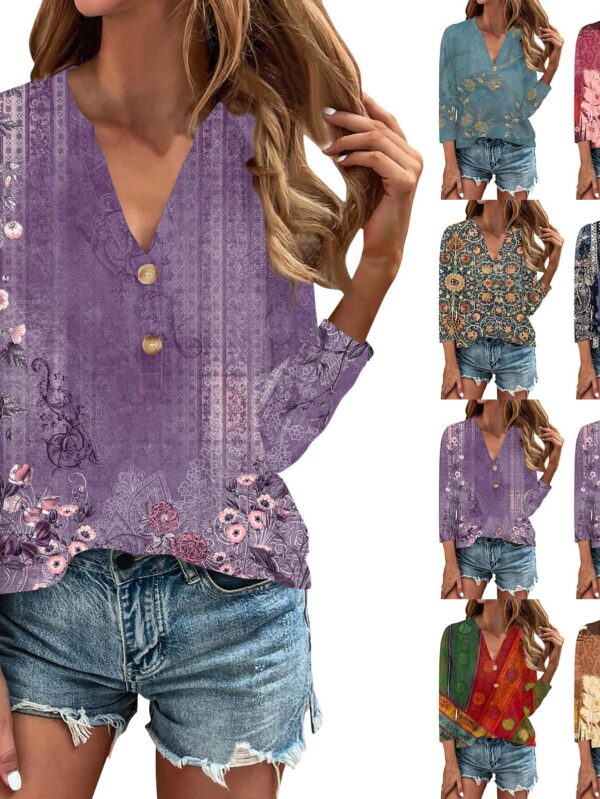 Women's Top 3/4 Sleeve Classic Retro Printed Shirt V-neck Loose Casual T-shirt XXL imbir