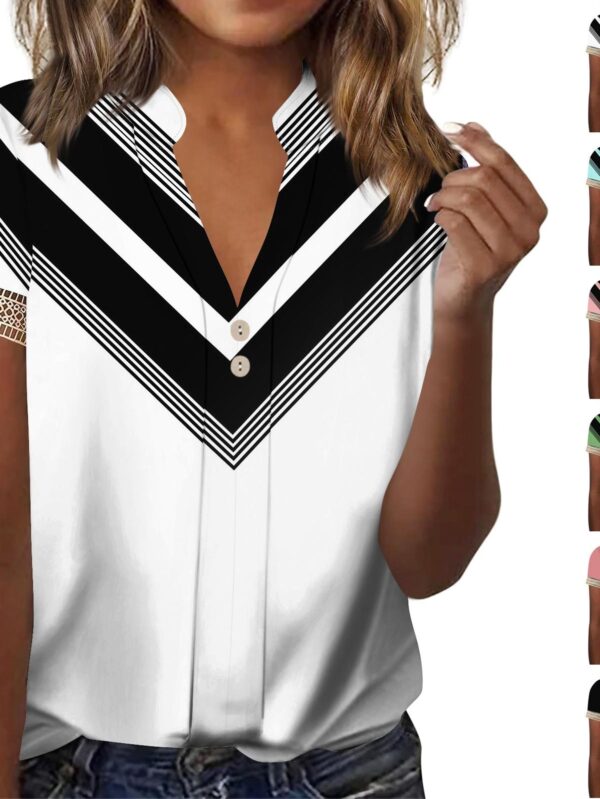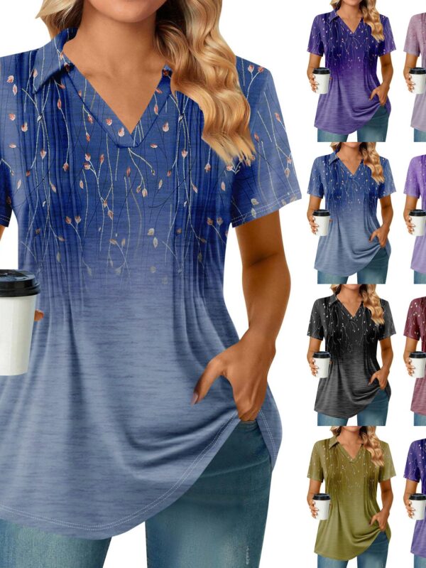 Womens Short Sleeve T Shirts Pleated V Neck Printing Tee Collared Summer Tops Fashion Business Casual Work L