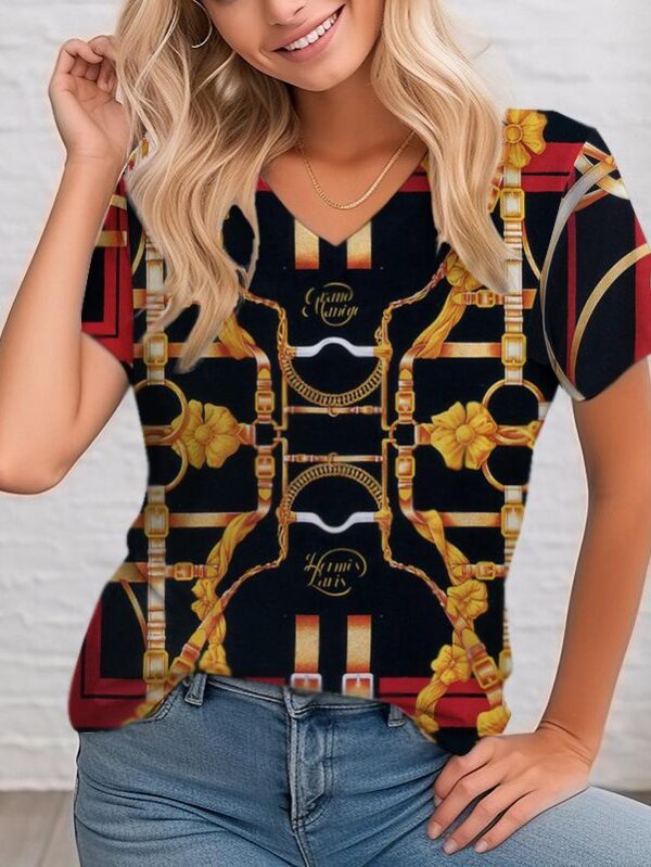 Women's V-neck Digital Printed Top Summer Short Sleeved Loose Women's Floral T-shirt S