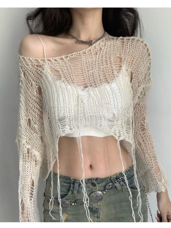 Y2K Damska koszulka z dzianiny Hollow Out Knitwear Skrócony sweter Wiosna Krótkie Sieci Sweter Vintage Koreańska odzież S