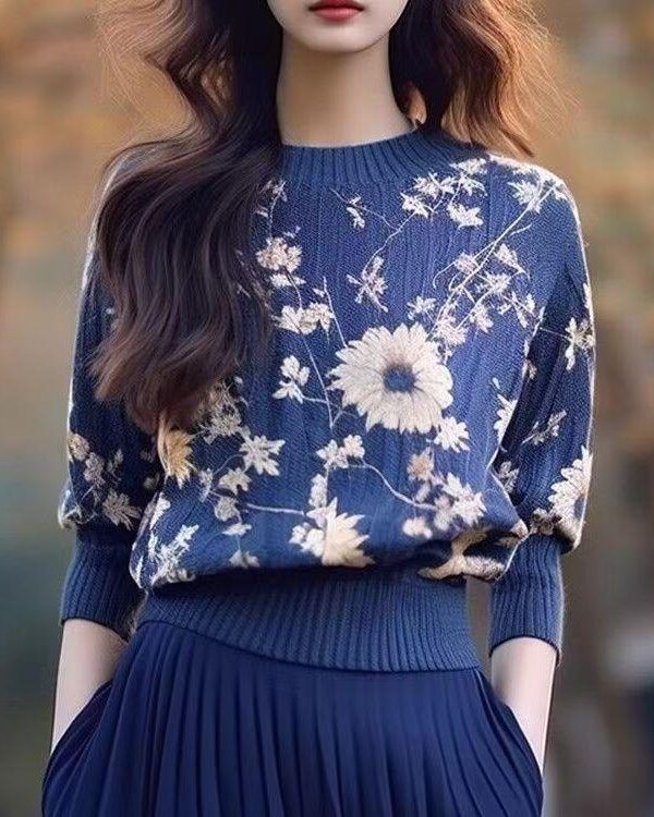 WTEMPO Women Long Sleeve Flower Pullover Sweater Soft Comfortable Jumper Fashion Knitwear Loose Sweater S niebieski