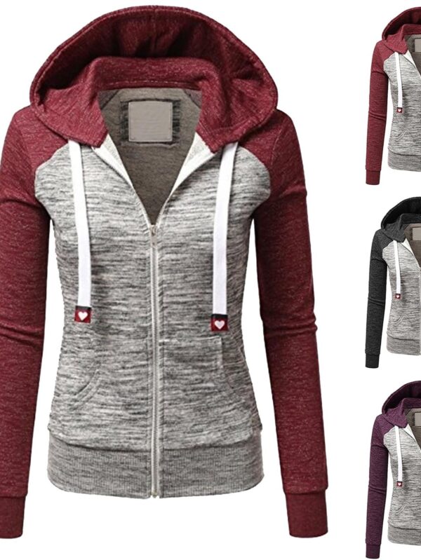 Women's Casual Fashion Color Block Long Sleeved Pocket Zipper Hooded Drawstring Sweatshirt Jacket L