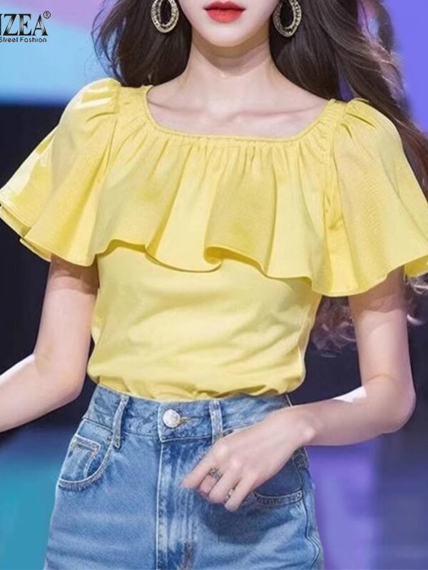 ZANZEA Women Casual Round Neck Short Sleeve Ruffles Blouse S żółty