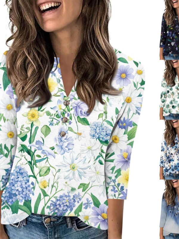 Women's Fashionable Casual 3/4 Sleeve Button Print V-Neck Pullover Top L czarny