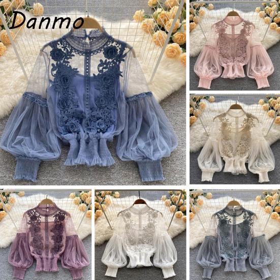 Danmo Korean Style Chic Sexy Lace Blouse Women Long Lantern Sleeve Shirt Floral Elegant Mesh Blusas One Size różowy