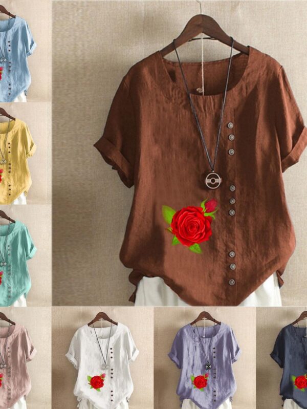 Women's Fashion Round Neck Short Sleeve T-shirt Casual Cotton Linen Graphic Shirt Leisure Loose Rose Prined Summer Blouse Tops S różowy