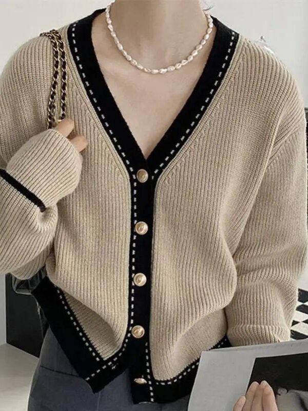 Retro kontrastowy sweter z dekoltem w serek sweter damski jesień i zima 2023 sweter damski luźna odzież wierzchnia sweter damski top One Size czarny