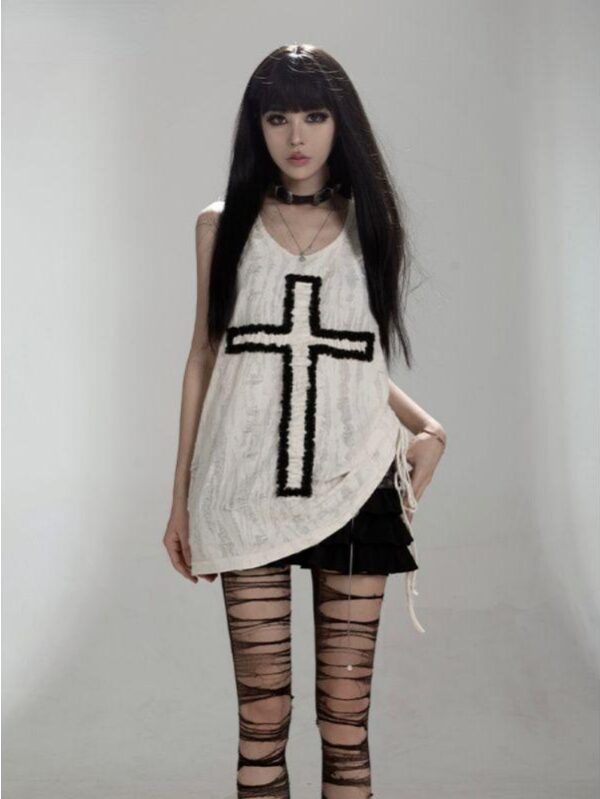 Y2k Estetyczny Tank Top Kobiety Gothic Punk Krzyż Patchwork Harajuku Streetwear Bez Rękawów Tee Plisowane Bandaż Fairy Grunge Tanks S biały