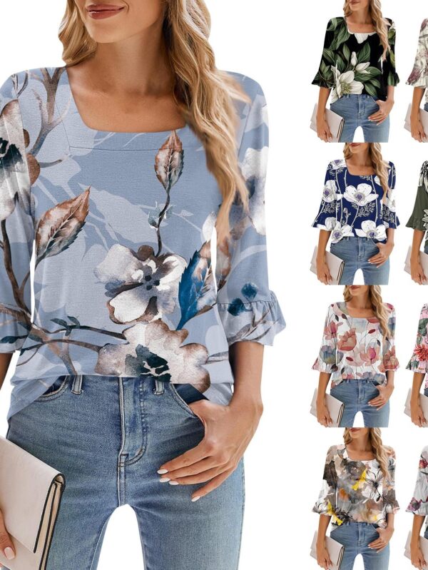 Women's Quarter Sleeved Flower Printed Shirt With Square Neck Loose Casual Top L kolor zielono-szary wojskowy