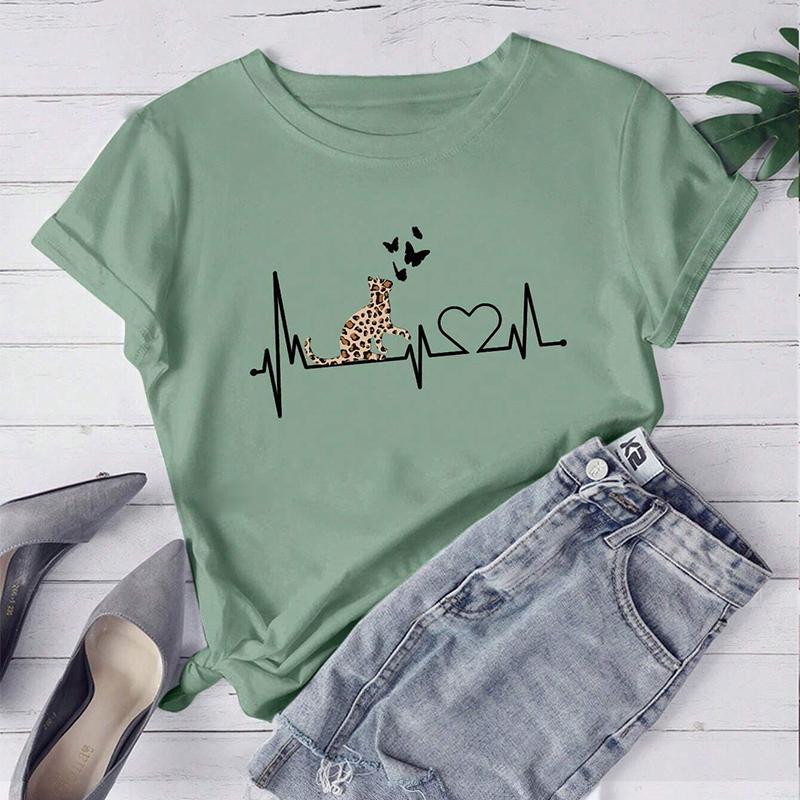Moda damska Love Cat Print T-shirt Zabawny swobodny T-shirt z okrągłym dekoltem i krótkimi rękawami Letnia koszulka damska XS różowy