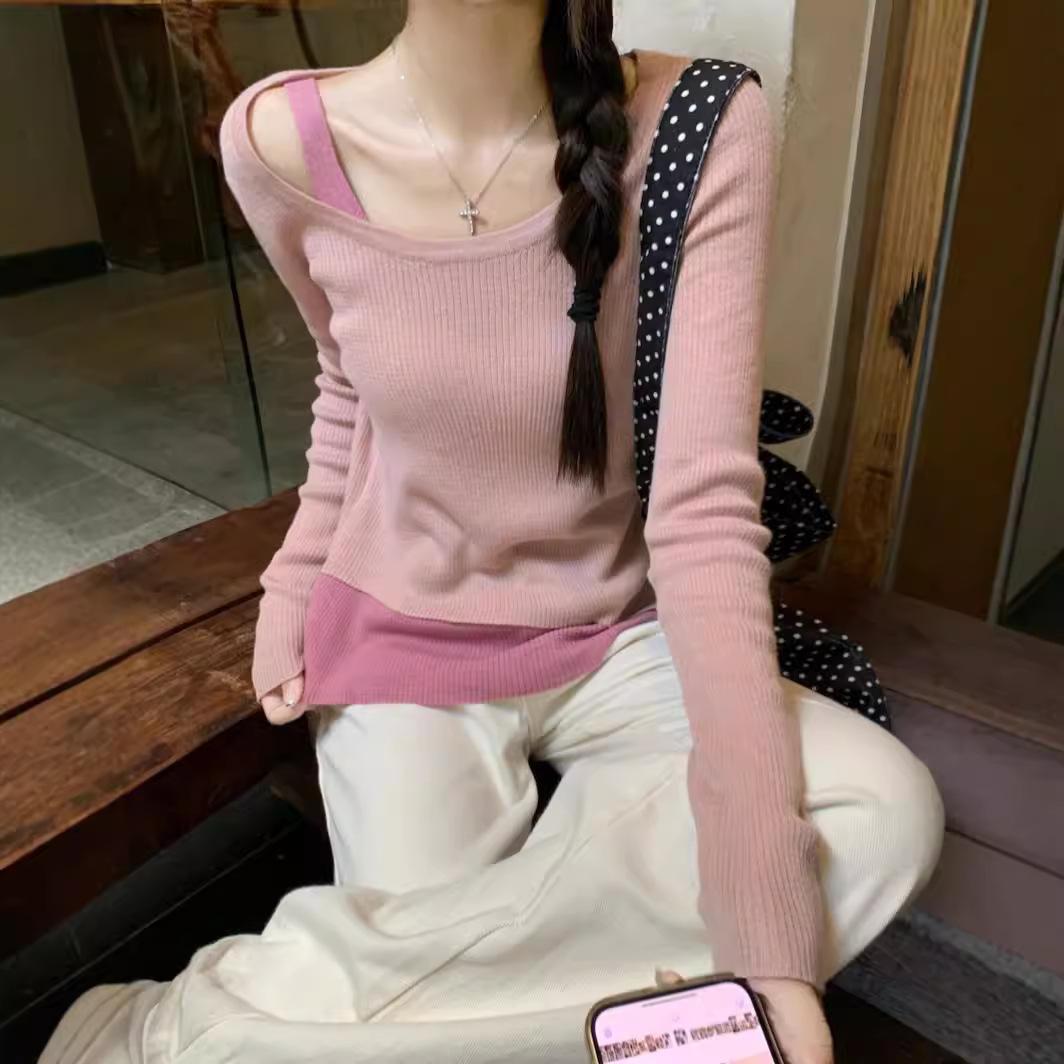 Women’s Autumn and Winter Strapless Pullover Knitted Irregular Sweater one size fits all różowy