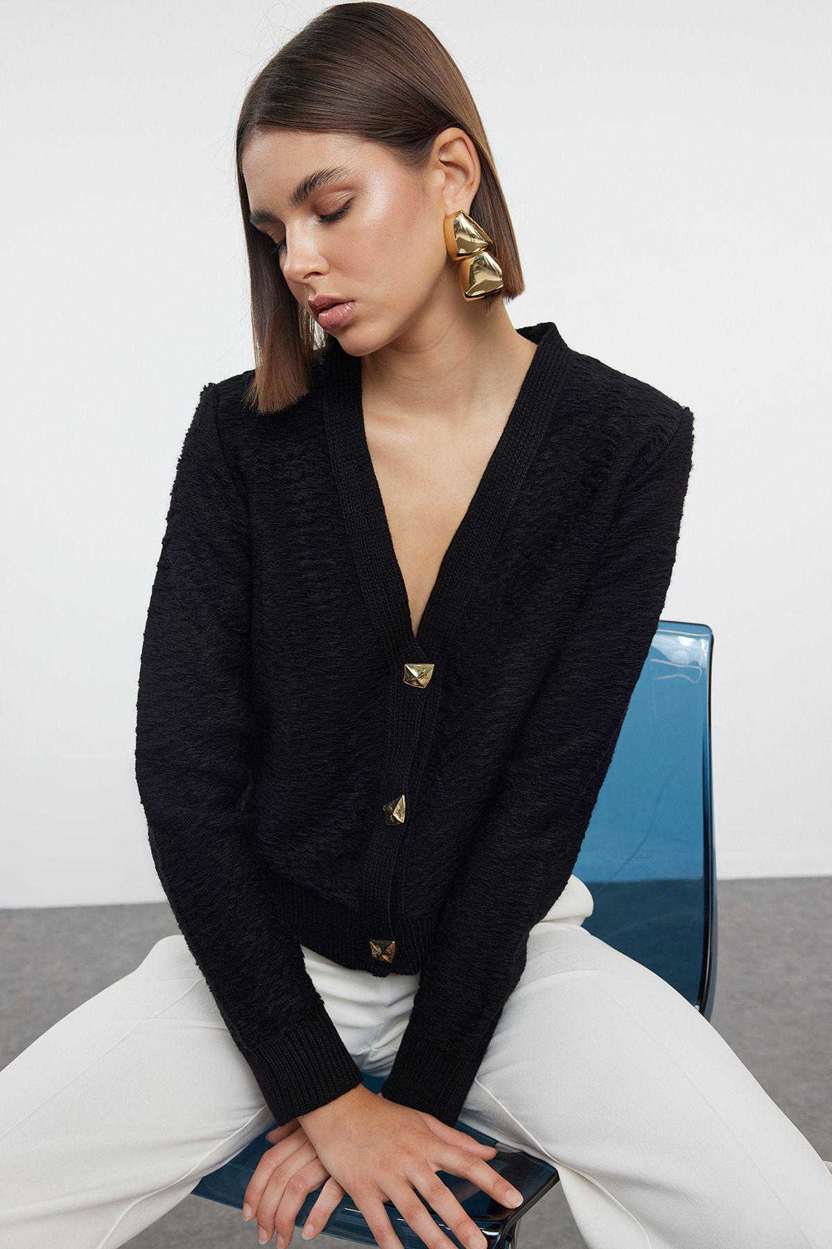 Women’s Fashion Stylish Cardigan Black Rose Button Detailed Knitwear Cardigan M